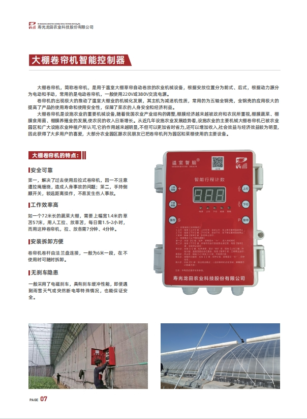 壽光龍?zhí)镛r(nóng)業(yè)科技股份有限公司于2014年創(chuàng)立于“蔬菜之鄉(xiāng)”----山東壽光。公司立志用科技服務(wù)三農(nóng),以幫助農(nóng)業(yè)企業(yè)和個(gè)人提高農(nóng)業(yè)生產(chǎn)率,協(xié)助農(nóng)業(yè)企業(yè)和個(gè)人生產(chǎn)健康安全的高品質(zhì)農(nóng)產(chǎn)品為使命。踐行“自強(qiáng)不息,厚德載物”的企業(yè)理念,專注于設(shè)施農(nóng)業(yè)裝備研發(fā),研發(fā)生產(chǎn)了“溫室智腦”智慧農(nóng)業(yè)物聯(lián)網(wǎng)系統(tǒng)、大棚智能放風(fēng)機(jī),“龍?zhí)ь^”大棚運(yùn)輸車,“春暖花開”紅外反射大棚保溫被,大棚卷簾機(jī)等系列產(chǎn)品。公司于2017年在齊魯股權(quán)交易中心掛牌上市,股票代碼302505。 公司擁有注冊(cè)商標(biāo)12個(gè),實(shí)用新型專利18項(xiàng),外觀專利4項(xiàng),并獲得了ISO9001質(zhì)量管理體系認(rèn)證證書,2021-2023年科技型中小企業(yè)稱號(hào)。溫室智腦大棚放風(fēng)機(jī),獲得2020年度農(nóng)業(yè)農(nóng)村部舉辦的創(chuàng)新比賽優(yōu)秀獎(jiǎng)。 2022年,中央網(wǎng)信辦、農(nóng)業(yè)農(nóng)村部、國(guó)家發(fā)展改革委、工業(yè)和信息化部、國(guó)家鄉(xiāng)村振興局聯(lián)合印發(fā)的《2022年數(shù)字鄉(xiāng)村發(fā)展工作要點(diǎn)》又進(jìn)一步細(xì)化了智慧農(nóng)業(yè)在2022年的重點(diǎn)任務(wù),龍?zhí)镛r(nóng)科將抓住歷史機(jī)遇,打造智能化的系列裝備,讓農(nóng)業(yè)生產(chǎn)更高效,更智能。